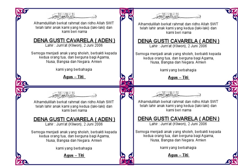 Nah itu tadi beberapa contoh kartu ucapan aqiqah bisa diedit format ms. Kartu ucapan syukuran pernikahan dalam box nasi. Download kartu ucapan aqiqah format word bisa diedit by mas udin in undangan pada pelaksanaan tasyakuran kelahiran anak biasanya orang tua akan menyertakan kartu ucapan. Download kartu ucapan aqiqah format word keren download kartu ucapan. Pada kartu ucapan tersebut tertera doa untuk anak yang di aqiqahi, nama anak, nama orangtua. Kartu ucapan aqiqah nasi kotak. Contoh ucapan tasyakuran pernikahan nasi box pdf free download cara membuat undangan untuk aqiqah selapanan dan syukuran di ms format undangan syukuran pernikahan word omfar mcpgroup co kotak ucapan ultah. Download contoh kartu ucapan syukuran kelahiran anak doc ms word. 30 contoh tulisan mengenang 100 hari wafatnya kata bijak kreatif. Kartu ucapan syukuran pernikahan dalam box nasi koleksi aneka info jual tas souvenir hajatan hantaran tasyakuran aqiqah 7 bulan haul pregnancy ms lomar 0812 9001 5559 nasi kotak syukuran 7 bulanan di surabaya sidoarjo cara membuat kartu ucapan selapanan bayi template kartu ucapan cara mudah membuat kartu ucapan pernikahan ucapan nasi kotak apk. Penggunaan kata amin dengan makna kabulkanlah yang tepat adalah aamiin, silahkan di rubah sendiri yhaa. Nah, lumayan rapih bukan, untuk mendapatkan file word dari desain kartu ucapan aqiqah di atas, anda dapat mendownload nya secara. Pc kartu ucapan aqiqah selapanan tasyakuran kelahiran tasyakuran aqiqah khitanan 4 bulanan dll di lapak spring store92 bukalapak.